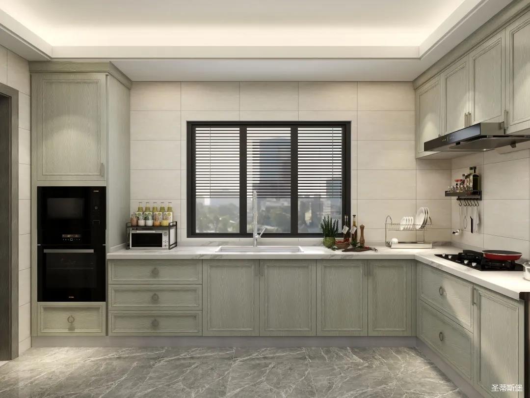 ▲厨房运用几何线条铺满一整面墙,是满满的灵动和美感,实木材质的质感赋予了厨房空间品质与格调。按比例分配大小,打造成储物格框架,让每个角落都留下业主生活的痕迹。